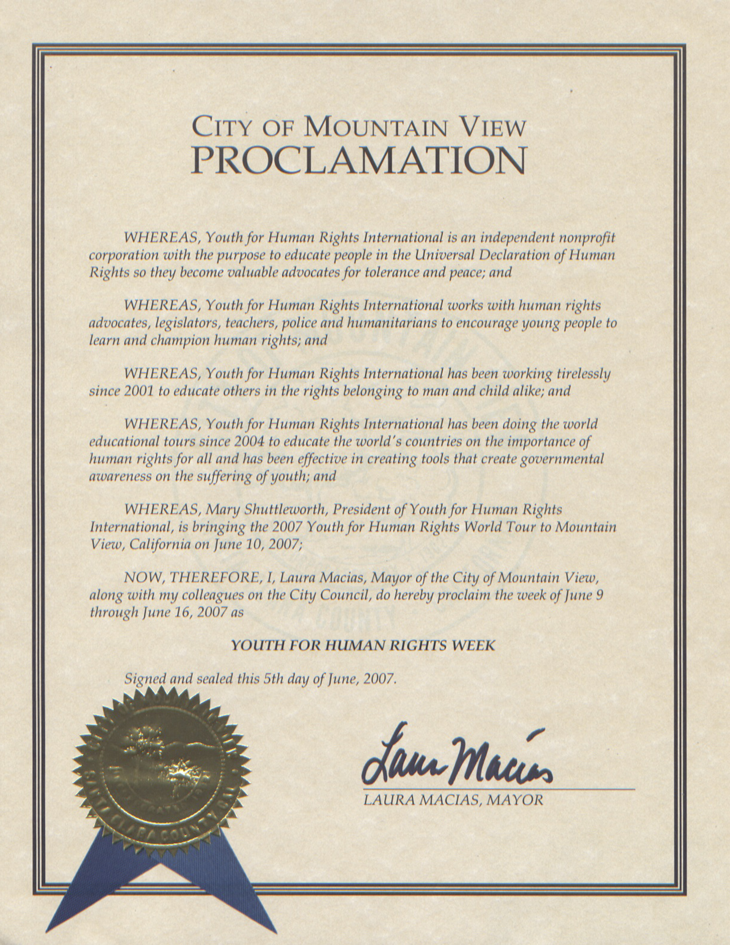 2007 – De Proclamatie van Mountain View, VS