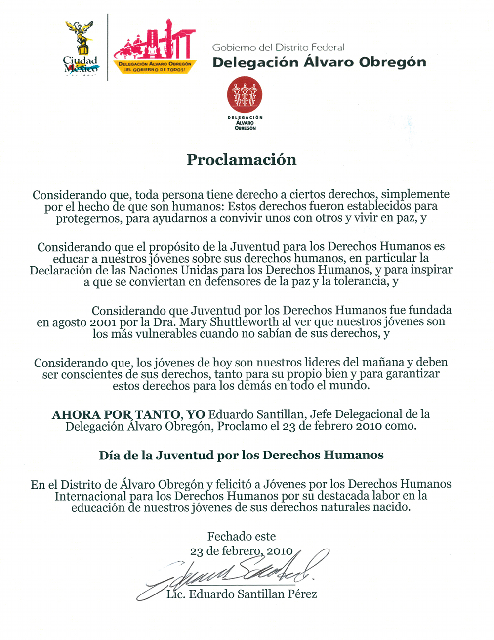 2010 – De proclamatie van de Jongeren voor Mensenrechten Dag in Mexico
